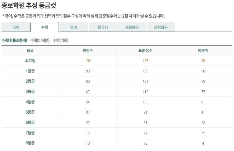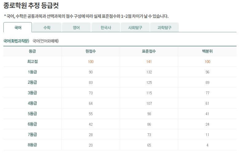 국어와 수학은 표준점수로, 다른 과목들은 원점수로 등급컷이 정해집니다. 같은 원점수라도 공통과 선택과목의 조합에 따라 국어와 수학의 등급은 달라질 수 있습니다. 메가스터디에서는 선택과목별 등급컷의 '원점수 범위'를 제공하지만, 실제 점수와는 다를 수 있으니 참고만 하시길 바랍니다.