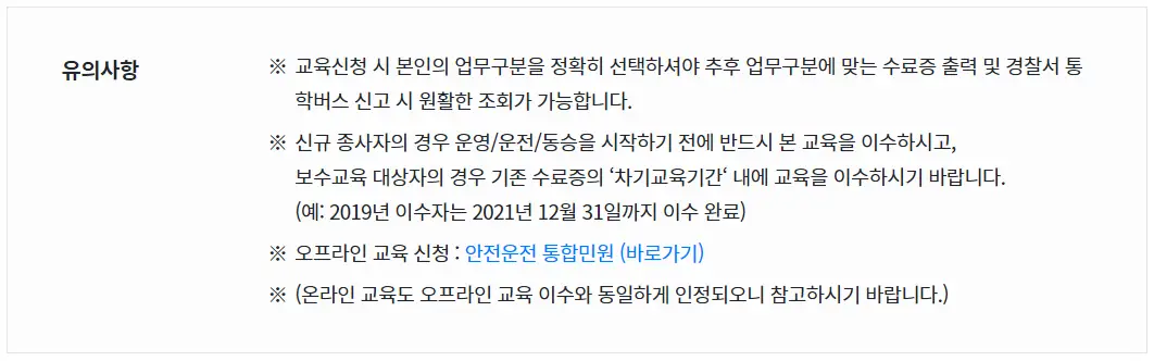 이상으로 어린이통학버스 안전교육 신청방법 등에 대해 알아봤습니다. 신규로 종사하시는 분이나 보수교육을 들어야하시는 분들이라면 온라이나 오프라인 교육 중 자신에게 맞는 교육방법을 선택하여 수강하시기 바랍니다.